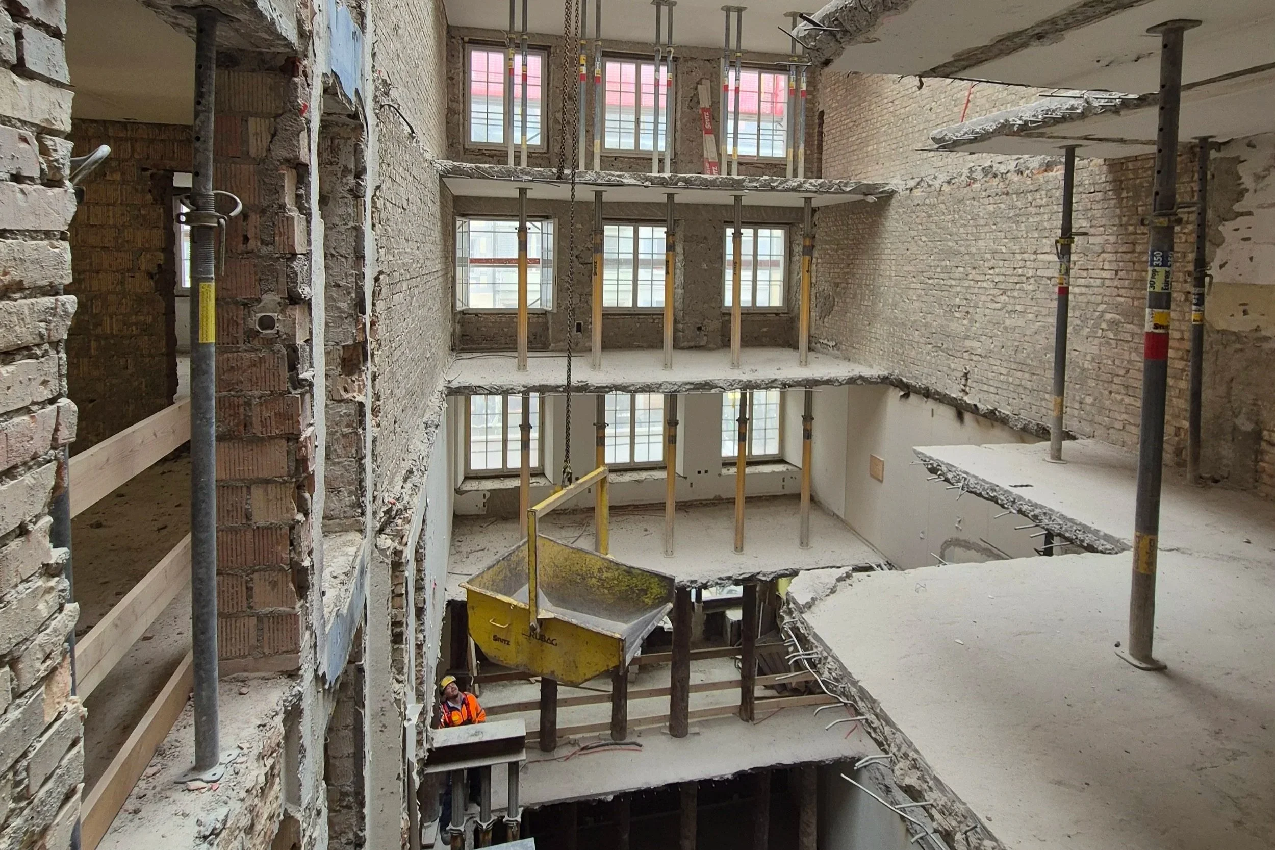 Diese Vorgehensweise ist notwendig, da das Gebäude vollständig entkernt wird und zahlreiche tragende Bauteile gesichert und abgefangen werden müssen. Die statischen Anforderungen sind enorm, jede Massnahme erfordert präzise Planung und sorgfältige Ausführung, um die Stabilität des gesamten Bauwerks jederzeit zu gewährleisten.
