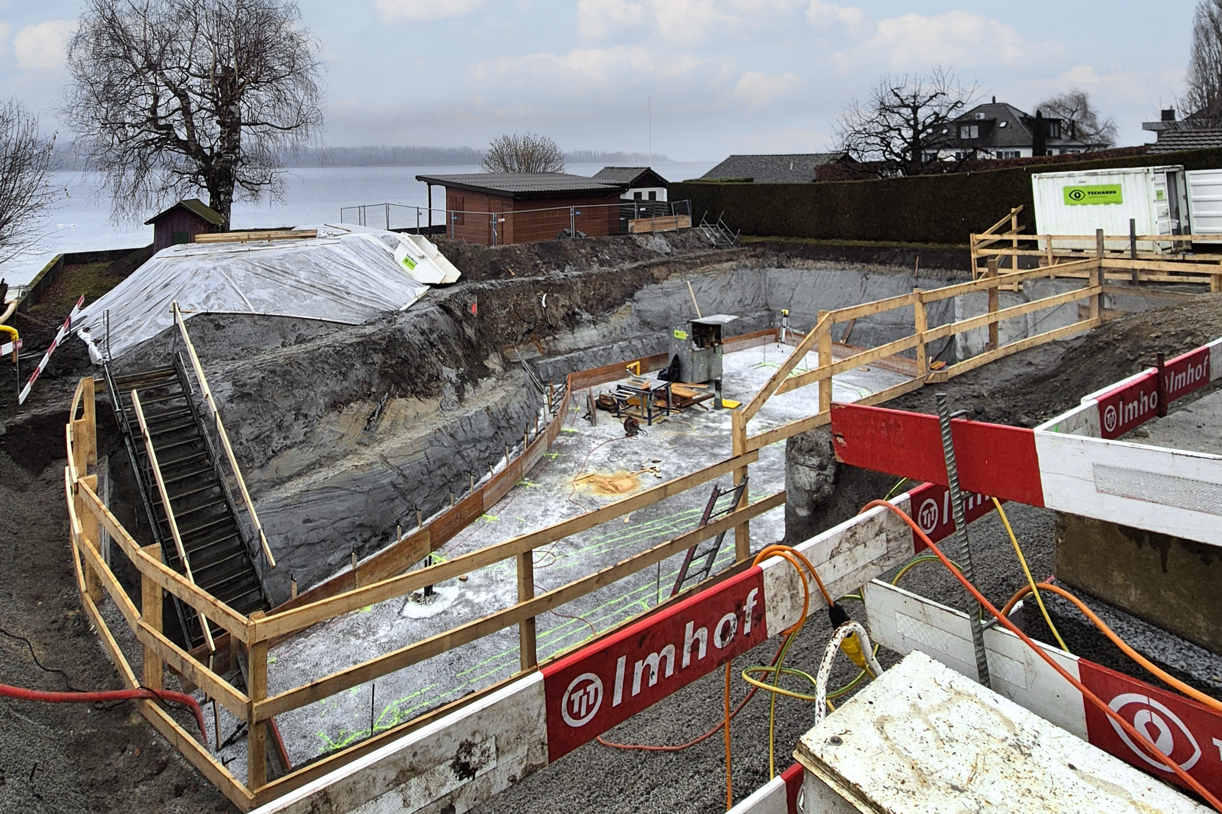 Nach dem Rückbau beginnt am Ufer des Bodensees die nächste sichtbare Phase des Projekts Oberwies. Der Aushub und die Hangsicherung wurden termingerecht abgeschlossen. Mit dem Aufbau des Krans starten nun die Baumeisterarbeiten. Das Gebäude wird in den kommenden Wochen Schritt für Schritt aus dem Terrain wachsen.